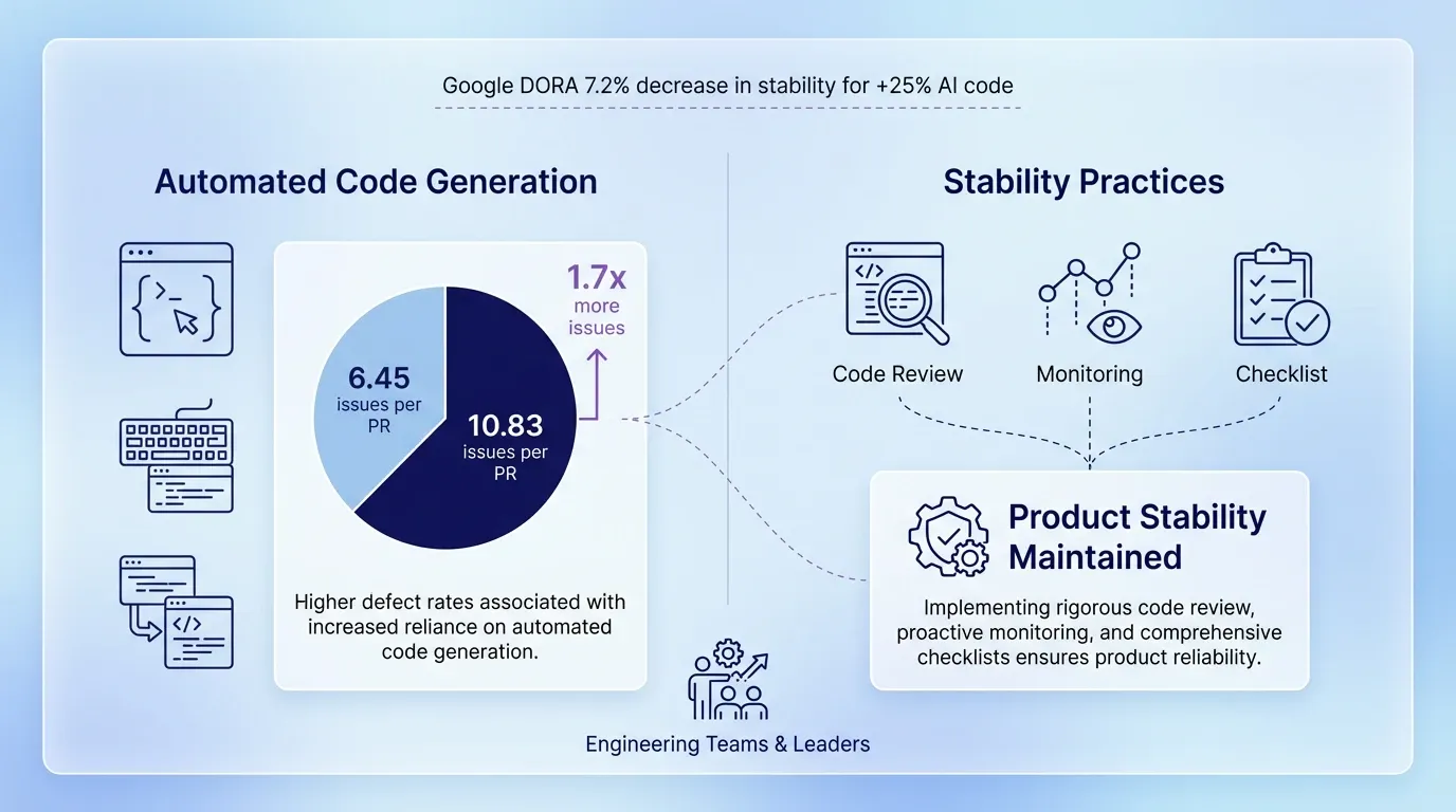 Without disciplined oversight, automated engines inject numerous defects into the main codebase. According to CodeRabbit, automatically generated code contains 1.7 times more issues overall, and it averages 10.83 issues per pull request compared to 6.45 issues for human code. Engineering departments can't sustain this error rate unless they completely halt feature development.